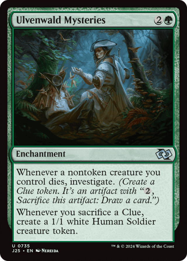 If a nontoken creature dies at the same time as Ulvenwald Mysteries leaves the battlefield, the first ability triggers. Similarly, if Ulvenwald Mysteries isn’t a token and has become a creature, it dying will cause its own first ability to trigger. — If you sacrifice a Clue as part of casting a spell or activating an ability, the last ability will resolve before that spell or ability. — The last ability is a triggered ability, not an activated ability. It doesn’t allow you to sacrifice a Clue whenever you want; rather, you need some other way of sacrificing it, such as the activated ability that Clue tokens have.