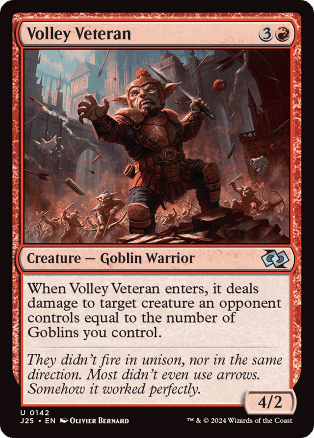 The number of Goblins you control is counted only as Volley Veteran's ability resolves. If Volley Veteran is still on the battlefield, it will count itself.
