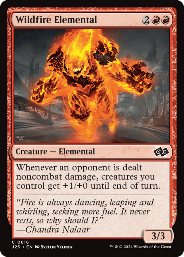 Combat damage is the damage that's dealt automatically by attacking and blocking creatures. Any other damage is noncombat damage, even if it's dealt during a combat phase by an attacking or blocking creature. — In a multiplayer game, if a source deals damage to multiple opponents at the same time, the last ability of Wildfire Elemental will trigger that many times. — The last ability of Wildfire Elemental triggers once for each event in which an opponent is dealt noncombat damage, regardless of how much damage that player is dealt. — Wildfire Elemental's triggered ability affects only creatures you control at the time it resolves. Creatures you begin to control later in the turn won't get +1/+0.