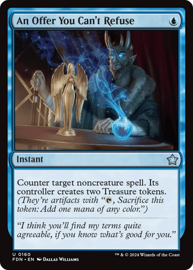 Counter target noncreature spell. Its controller creates two Treasure tokens. (They're artifacts with "{T}, Sacrifice this token: Add one mana of any color.")