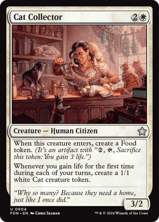 When this creature enters, create a Food token. (It's an artifact with "{2}, {T}, Sacrifice this token: You gain 3 life.") Whenever you gain life for the first time during each of your turns, create a 1/1 white Cat creature token.