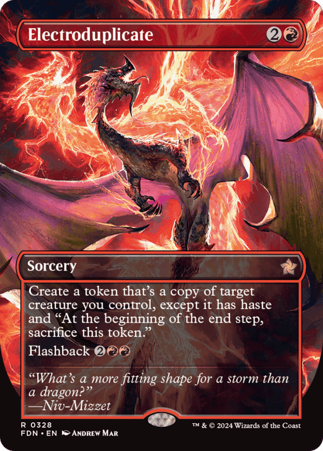 "Flashback [cost]" means "You may cast this card from your graveyard by paying [cost] rather than paying its mana cost" and "If the flashback cost was paid, exile this card instead of putting it anywhere else any time it would leave the stack." — A spell cast using flashback will always be exiled afterward, whether it resolves, is countered, or leaves the stack in some other way. — Any enters abilities of the copied creature will trigger when the token enters. Any "as [this permanent] enters" or "[this permanent] enters with" abilities of the copied creature will also work. — If a card with flashback is put into your graveyard during your turn, you can cast it if it's legal to do so before any other player can take any actions. — If the copied creature is a token, the token that's created copies the original characteristics of that token as stated by the effect that created the token, with the listed exceptions. — If the copied creature is copying something else, then the token enters as whatever that creature copied, with the listed exceptions. — The token created by Electroduplicate copies exactly what was printed on the original creature and nothing else, with the listed exceptions (unless that creature is copying something else or is a token; see below). It doesn't copy whether that creature is tapped or untapped, whether it has any counters on it or Auras and Equipment attached to it, or any non-copy effects that have changed its power, toughness, types, color, or so on. — To determine the total cost of a spell, start with the mana cost or alternative cost (such as a flashback cost) you're paying, add any cost increases, then apply any cost reductions. The mana value of the spell is determined only by its mana cost, no matter what the total cost to cast the spell was. — You can cast a spell using flashback even if it was somehow put into your graveyard without having been cast. — You must still follow any timing restrictions and permissions, including those based on the card's type. For instance, you can cast a sorcery using flashback only when you could normally cast a sorcery.
