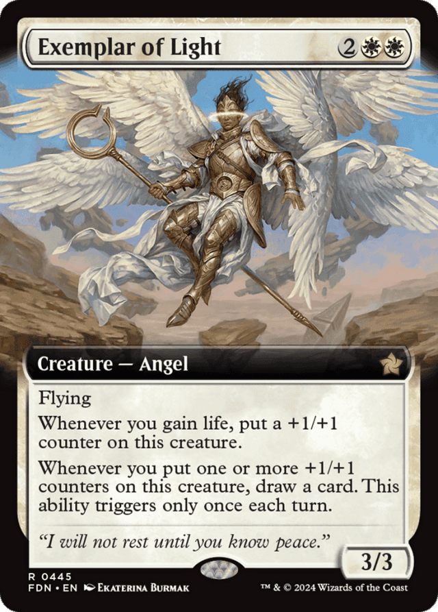 Each creature with lifelink dealing combat damage causes a separate life-gaining event. For example, if two creatures you control with lifelink deal combat damage at the same time, Exemplar of Light's second ability will trigger twice. However, if a single creature you control with lifelink deals combat damage to multiple creatures, players, planeswalkers, and/or battles at the same time (perhaps because it has trample or was blocked by more than one creature), the ability will trigger only once. — Exemplar of Light's last ability triggers whenever you put one or more +1/+1 counters on it for any reason, not just as a result of its second ability. — Exemplar of Light's second ability triggers just once for each life-gaining event, whether it's 1 life from Dazzling Angel or 4 life from Apothecary Stomper. — If Exemplar of Light is dealt lethal damage at the same time that you gain life, it won't receive a counter from its second ability in time to save it. — If you gain an amount of life "for each" of something or "equal to the number" of something, that life is gained as one event and Exemplar of Light's second ability triggers only once. — In a Two-Headed Giant game, life gained by your teammate won't cause Exemplar of Light's second ability to trigger, even though it caused your team's life total to increase.