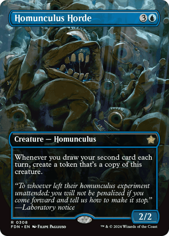 Homunculus Horde doesn't need to have been under your control when the first card is drawn for its ability to trigger. As long as you control it when you draw your second card in a turn, that ability will trigger. — If Homunculus Horde leaves the battlefield before its triggered ability resolves, the token will still enter as a copy of Homunculus Horde, using Homunculus Horde's copiable values from when it was last on the battlefield. — In the unusual case where Homunculus Horde becomes a copy of something else while its triggered ability is on the stack but before it resolves, the token will enter as a copy of whatever Homunculus Horde is copying. (Sometimes a horde of homunculi isn't helpful.) — The token copy will have Homunculus Horde's ability and will be able to create copies of itself. — The token doesn't copy whether Homunculus Horde is tapped or untapped, whether it has any counters on it or Auras attached to it, or any non-copy effects that have changed its power, toughness, types, color, and so on.