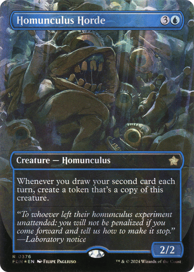 Homunculus Horde doesn't need to have been under your control when the first card is drawn for its ability to trigger. As long as you control it when you draw your second card in a turn, that ability will trigger. — If Homunculus Horde leaves the battlefield before its triggered ability resolves, the token will still enter as a copy of Homunculus Horde, using Homunculus Horde's copiable values from when it was last on the battlefield. — In the unusual case where Homunculus Horde becomes a copy of something else while its triggered ability is on the stack but before it resolves, the token will enter as a copy of whatever Homunculus Horde is copying. (Sometimes a horde of homunculi isn't helpful.) — The token copy will have Homunculus Horde's ability and will be able to create copies of itself. — The token doesn't copy whether Homunculus Horde is tapped or untapped, whether it has any counters on it or Auras attached to it, or any non-copy effects that have changed its power, toughness, types, color, and so on.