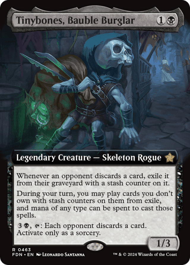 Whenever an opponent discards a card, exile it from their graveyard with a stash counter on it. During your turn, you may play cards you don't own with stash counters on them from exile, and mana of any type can be spent to cast those spells. {3}{B}, {T}: Each opponent discards a card. Activate only as a sorcery.