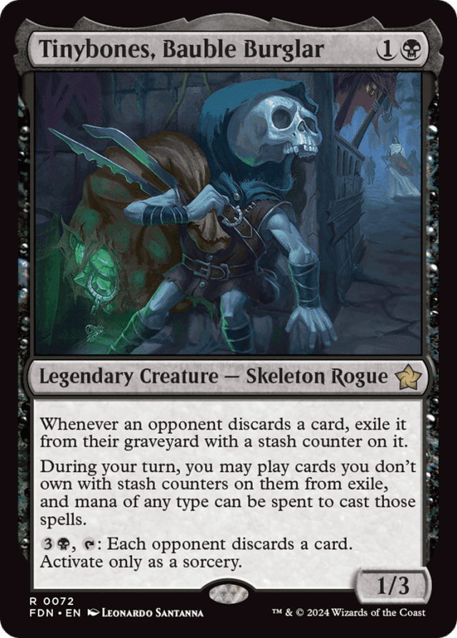 Whenever an opponent discards a card, exile it from their graveyard with a stash counter on it. During your turn, you may play cards you don't own with stash counters on them from exile, and mana of any type can be spent to cast those spells. {3}{B}, {T}: Each opponent discards a card. Activate only as a sorcery.