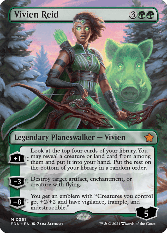 [+1]: Look at the top four cards of your library. You may reveal a creature or land card from among them and put it into your hand. Put the rest on the bottom of your library in a random order. [−3]: Destroy target artifact, enchantment, or creature with flying. [−8]: You get an emblem with "Creatures you control get +2/+2 and have vigilance, trample, and indestructible."