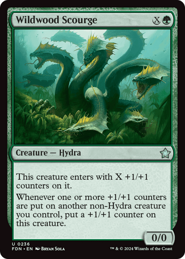 Abilities that trigger when counters are put on a creature trigger when a creature enters with counters and when a player puts counters on a creature. — Wildwood Scourge gets just one +1/+1 counter when its last ability resolves, no matter how many counters were put on the non-Hydra creature.