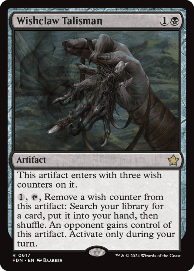 Once Wishclaw Talisman runs out of wish counters, it remains on the battlefield. You can't activate its last ability at all. — You choose which opponent gains control of Wishclaw Talisman while its ability is resolving. If that player later leaves the game, you regain control of Wishclaw Talisman.