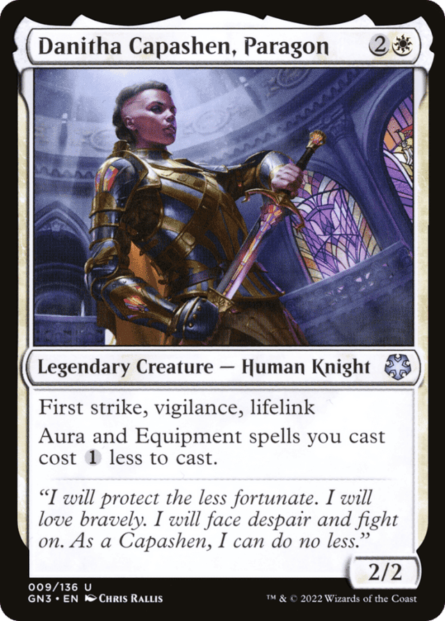 First strike, vigilance, lifelink Aura and Equipment spells you cast cost {1} less to cast.