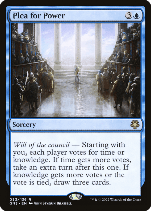Will of the council — Starting with you, each player votes for time or knowledge. If time gets more votes, take an extra turn after this one. If knowledge gets more votes or the vote is tied, draw three cards.