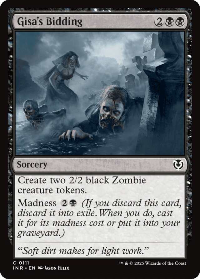 Create two 2/2 black Zombie creature tokens. Madness {2}{B} (If you discard this card, discard it into exile. When you do, cast it for its madness cost or put it into your graveyard.)