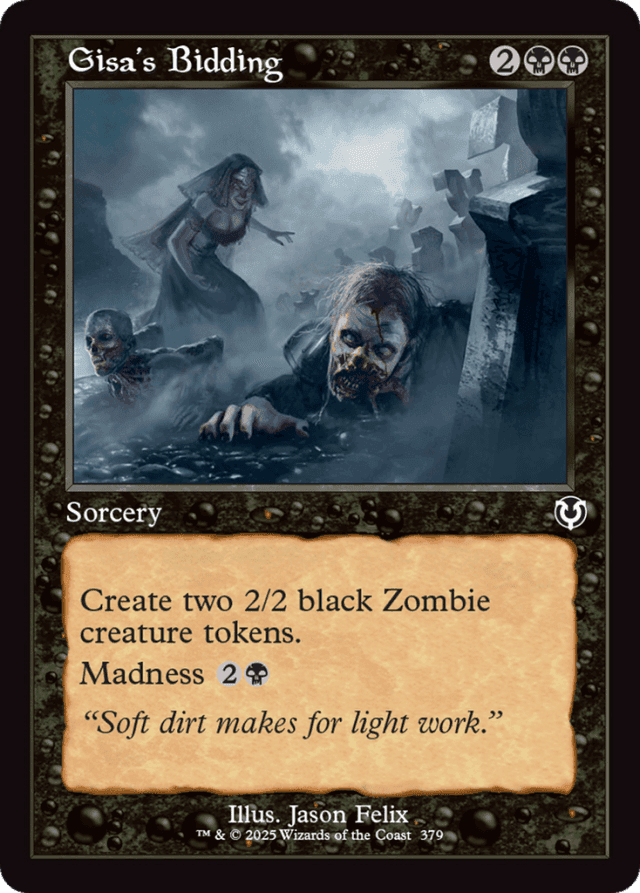 Create two 2/2 black Zombie creature tokens. Madness {2}{B} (If you discard this card, discard it into exile. When you do, cast it for its madness cost or put it into your graveyard.)