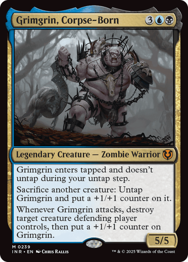 Grimgrin enters tapped and doesn't untap during your untap step. Sacrifice another creature: Untap Grimgrin and put a +1/+1 counter on it. Whenever Grimgrin attacks, destroy target creature defending player controls, then put a +1/+1 counter on Grimgrin.