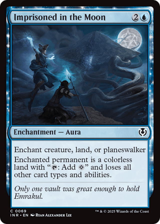 At the time the permanent becomes enchanted, Imprisoned in the Moon causes it to lose all abilities except the noted mana ability. Any abilities the permanent gains after that point will work normally. — Becoming a land may cause other Auras to become illegally attached. These are put into their owner's graveyard, and any Equipment attached to the land become unattached and remain on the battlefield. Counters on the land remain on it even if they don't do anything. — If the enchanted permanent is a land and has land types, it retains those types even though it loses any intrinsic mana abilities associated with them. For example, a Plains enchanted by Imprisoned in the Moon is still a Plains, but it can't tap for {W}, only for {C}. — If you remove Imprisoned in the Moon from a planeswalker after tapping it for mana, you can still activate a loyalty ability of that planeswalker even though it's tapped. — The permanent will keep any supertypes it previously had. Notably, if Imprisoned in the Moon is enchanting a legendary permanent, that permanent will continue to be legendary.