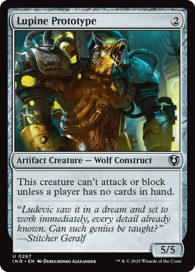 If a creature can’t attack or block unless you return a permanent to your hand, and your hand is empty, you can attack or block with that creature and Lupine Prototype. This is because the legality of chosen attackers and blockers is checked before costs are paid. — Lupine Prototype’s restriction applies only at the moment that attackers and blockers are chosen. If a player puts a card into their hand after Lupine Prototype has attacked or blocked, it won’t be removed from combat.