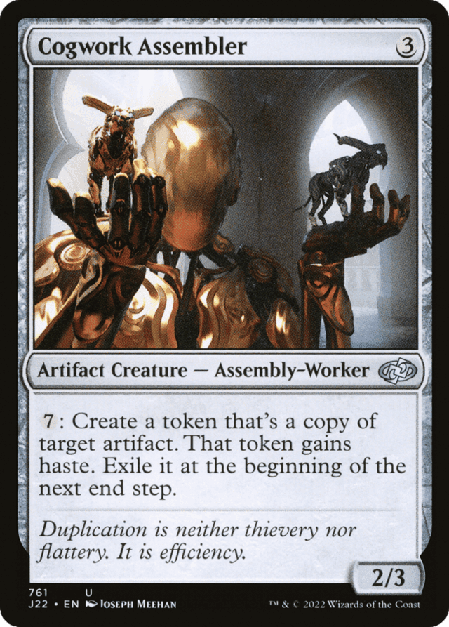 Any enters-the-battlefield abilities of the copied artifact will trigger when the token enters the battlefield. Any “as [this artifact] enters the battlefield” or “[this artifact] enters the battlefield with” abilities of the chosen artifact will also work. — If the copied artifact has {X} in its mana cost, X is considered to be 0. — If the copied artifact is a token, the token created with Cogwork Assembler copies the original characteristics of that token as stated by the effect that that created that token. — If the copied artifact is copying something else (for example, if the copied artifact is a Sculpting Steel), then the token enters the battlefield as whatever that artifact copied. — The token copies exactly what was printed on the original artifact and nothing else (unless that artifact is copying something else or is a token; see below). It doesn't copy whether that artifact is tapped or untapped, whether it has any counters on it or Auras and Equipment attached to it, or any non-copy effects that have changed its power, toughness, types, color, or so on.