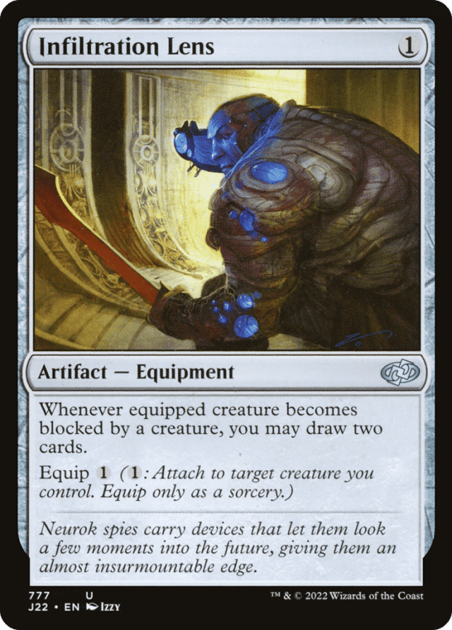 If the equipped creature becomes blocked by multiple creatures, Infiltration Lens’s ability triggers that many times.