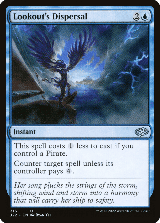 Once you announce that you’re casting Lookout’s Dispersal, no player may take other actions until the spell’s been paid for. Notably, players can’t try to raise the spell’s cost by removing your Pirates.