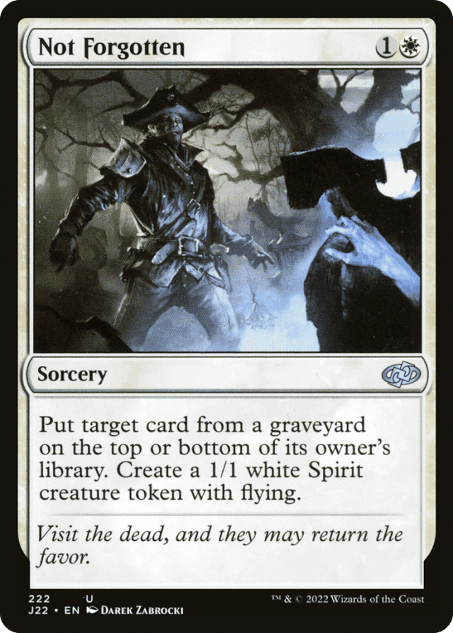 You choose whether to put the target card on the top or bottom of its owner’s library as Not Forgotten resolves. — You get the Spirit token, not the owner of the target card.