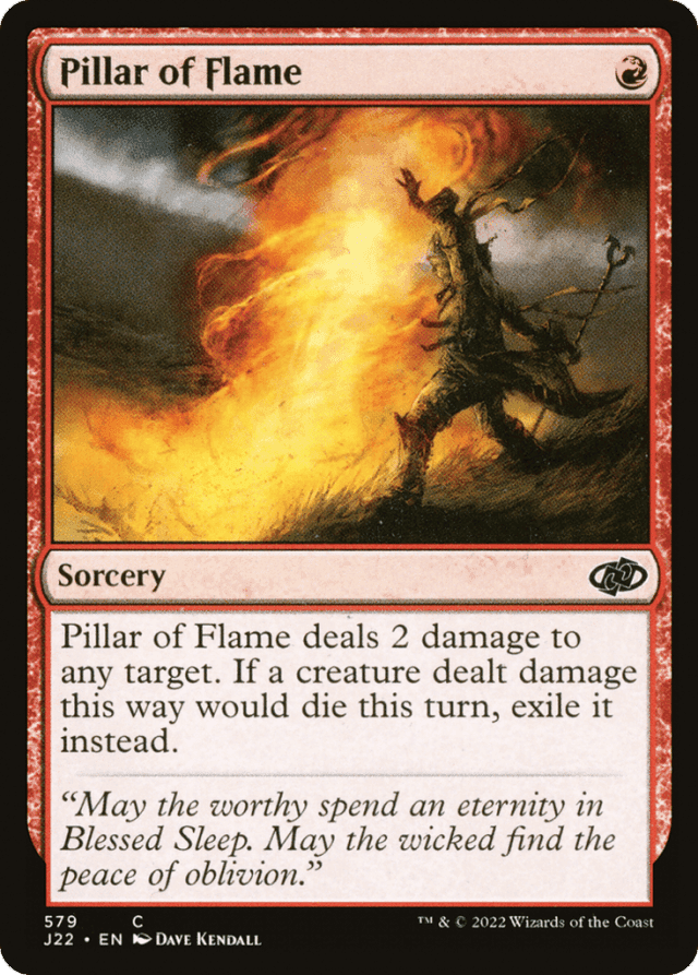 Pillar of Flame deals 2 damage to any target. If a creature dealt damage this way would die this turn, exile it instead.