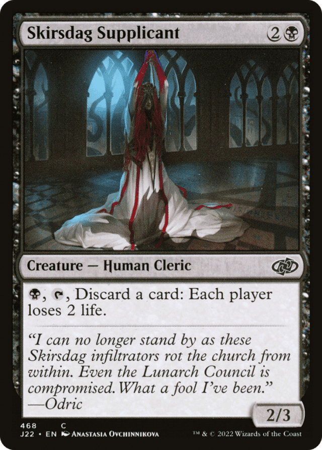 If Skirsdag Supplicant’s ability causes each player’s life total to become 0 or less, the game ends in a draw. — In a Two-Headed Giant game, Skirsdag Supplicant’s ability causes each player to lose 2 life, so each team loses a total of 4 life.