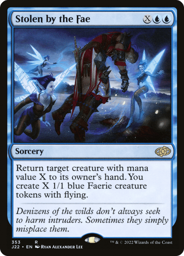 If a creature on the battlefield has {X} in its mana cost, X is considered to be 0. — If the target creature is an illegal target by the time Stolen by the Fae tries to resolve, the spell won't resolve. You won't create any Faerie tokens.