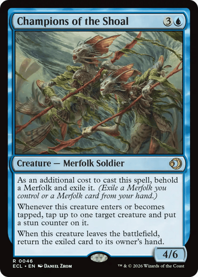 As an additional cost to cast this spell, behold a Merfolk and exile it. (Exile a Merfolk you control or a Merfolk card from your hand.) Whenever this creature enters or becomes tapped, tap up to one target creature and put a stun counter on it. When this creature leaves the battlefield, return the exiled card to its owner's hand.