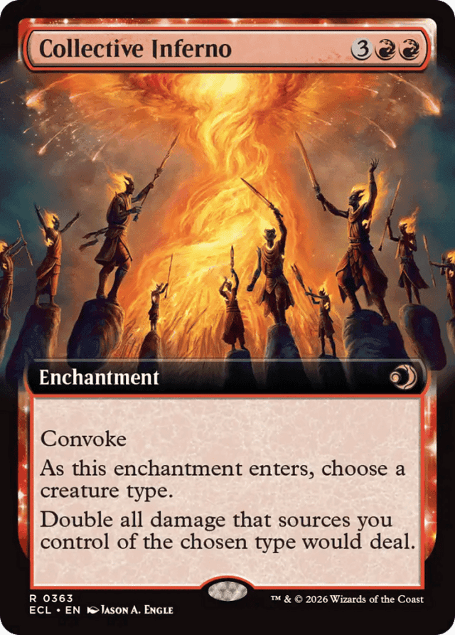 Convoke (Your creatures can help cast this spell. Each creature you tap while casting this spell pays for {1} or one mana of that creature's color.) As this enchantment enters, choose a creature type. Double all damage that sources you control of the chosen type would deal.