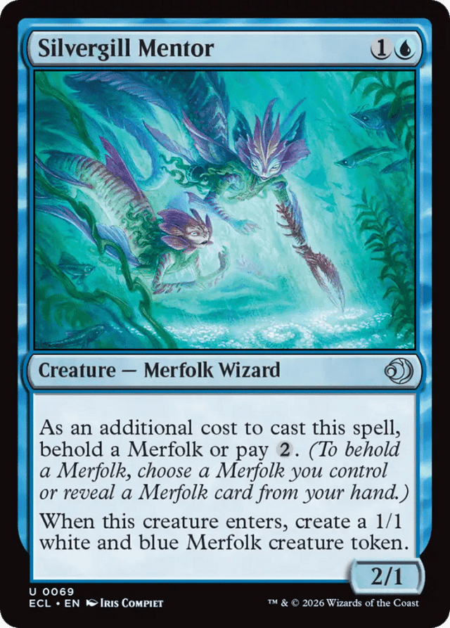 As an additional cost to cast this spell, behold a Merfolk or pay {2}. (To behold a Merfolk, choose a Merfolk you control or reveal a Merfolk from your hand.) When this creature enters, create a 1/1 white and blue Merfolk creature token.