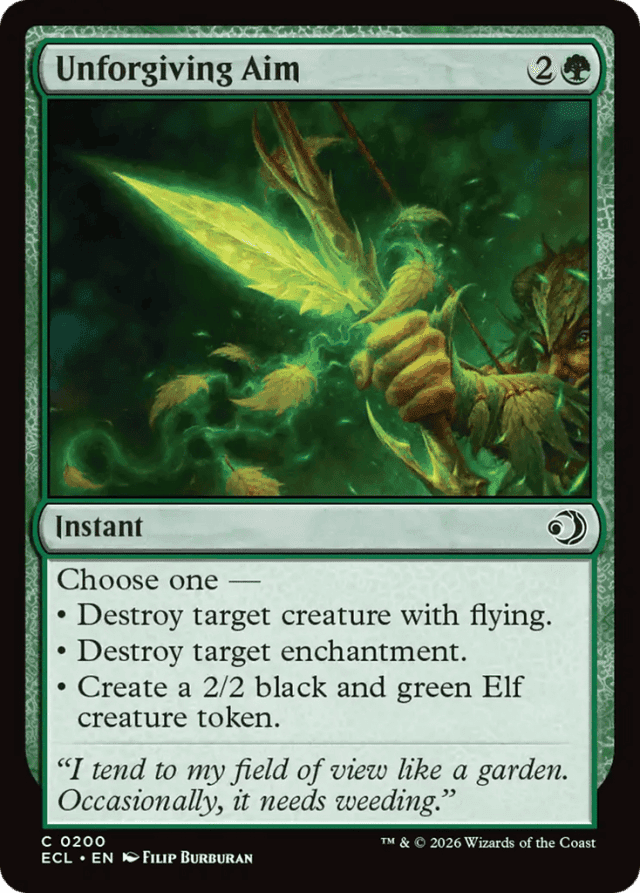 Choose one — • Destroy target creature with flying. • Destroy target enchantment. • Create a 2/2 black and green Elf creature token.