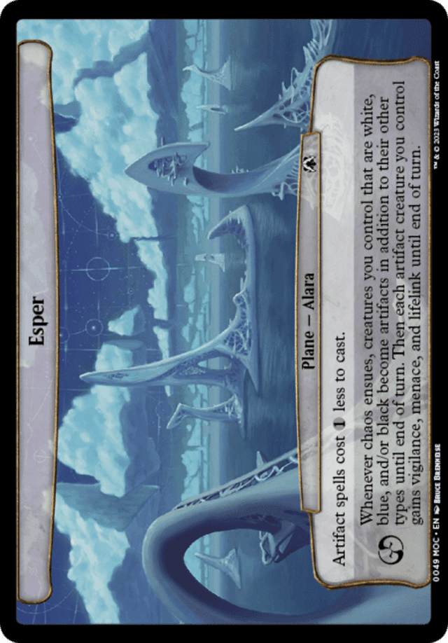 Esper’s first ability doesn’t change the mana cost or mana value of any artifact spell. It changes only the total cost players pay. — If a spell you cast has {X} in its mana cost, you choose the value of X before calculating the spell’s total cost. For example, if an artifact spell’s mana cost is {X}{X}, you could choose 2 as the value of X and pay {3} to cast the spell. — If there are additional costs to cast an artifact spell, or if the cost to cast a spell is increased by an effect (such as the one created by Thalia, Guardian of Thraben’s ability), apply those increases before applying cost reductions. — That ability can’t reduce the amount of colored mana players pay for a spell. It reduces only the generic component of that cost. — The cost reduction can apply to alternative costs such as prototype costs. — The set of artifact creatures affected by the chaos ability is determined as that ability resolves. Artifact creatures you begin to control later in the turn and permanents that become artifact creatures later in the turn won’t get the bonuses.
