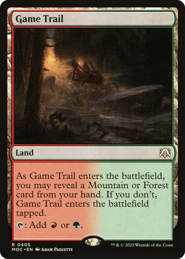 If a Mountain or Forest is entering the battlefield from your hand at the same time as Game Trail, you may reveal the other land to have Game Trail enter untapped. — If an effect instructs you to put Game Trail onto the battlefield tapped, it will still enter the battlefield tapped even if you reveal a land card from your hand. — Lands don't have a subtype just because they can produce mana of the corresponding color. Game Trail itself is neither a Mountain nor a Forest, even though it produces red and green mana, so you can't reveal one to satisfy the ability of another. — You may reveal any land card with either or both of the appropriate subtypes. It doesn't have to be a basic land. For example, you could reveal Canopy Vista from the Battle for Zendikar set to satisfy the ability of Game Trail.