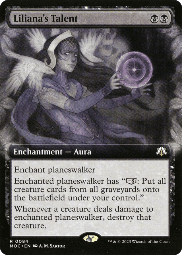 Enchant planeswalker Enchanted planeswalker has "[−8]: Put all creature cards from all graveyards onto the battlefield under your control." Whenever a creature deals damage to enchanted planeswalker, destroy that creature.