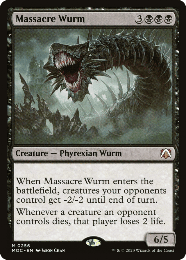If a creature an opponent controls dies at the same time as Massacre Wurm, Massacre Wurm's last ability triggers for that creature. — If your life total is brought to 0 or less at the same time that a creature an opponent controls is dealt lethal damage, you lose the game before Massacre Wurm's last ability goes on the stack. — Massacre Wurm's first ability affects only creatures your opponents control at the time it resolves. Creatures they begin to control later in the turn won't get -2/-2. — Massacre Wurm's triggered ability triggers if a creature an opponent controls dies for any reason, including from its first ability reducing its toughness to 0, as long as Massacre Wurm remains on the battlefield.