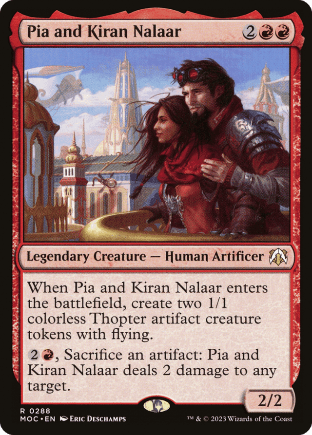 When Pia and Kiran Nalaar enters, create two 1/1 colorless Thopter artifact creature tokens with flying. {2}{R}, Sacrifice an artifact: Pia and Kiran Nalaar deals 2 damage to any target.