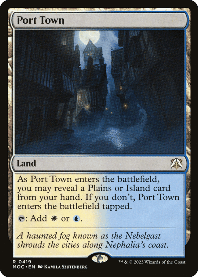 If a Plains or Island is entering the battlefield from your hand at the same time as Port Town, you may reveal the other land to have Port Town enter untapped. — If an effect instructs you to put Port Town onto the battlefield tapped, it will still enter the battlefield tapped even if you reveal a land card from your hand. — Lands don't have a subtype just because they can produce mana of the corresponding color. Port Town itself is neither a Plains nor an Island, even though it produces white and blue mana, so you can't reveal one to satisfy the ability of another. — You may reveal any land card with either or both of the appropriate subtypes. It doesn't have to be a basic land. For example, you could reveal Canopy Vista from the Battle for Zendikar set to satisfy the ability of Port Town.