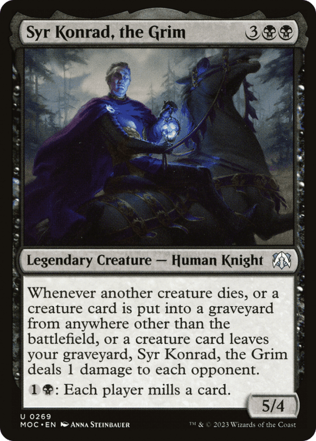 Whenever another creature dies, or a creature card is put into a graveyard from anywhere other than the battlefield, or a creature card leaves your graveyard, Syr Konrad deals 1 damage to each opponent. {1}{B}: Each player mills a card. (They each put the top card of their library into their graveyard.)