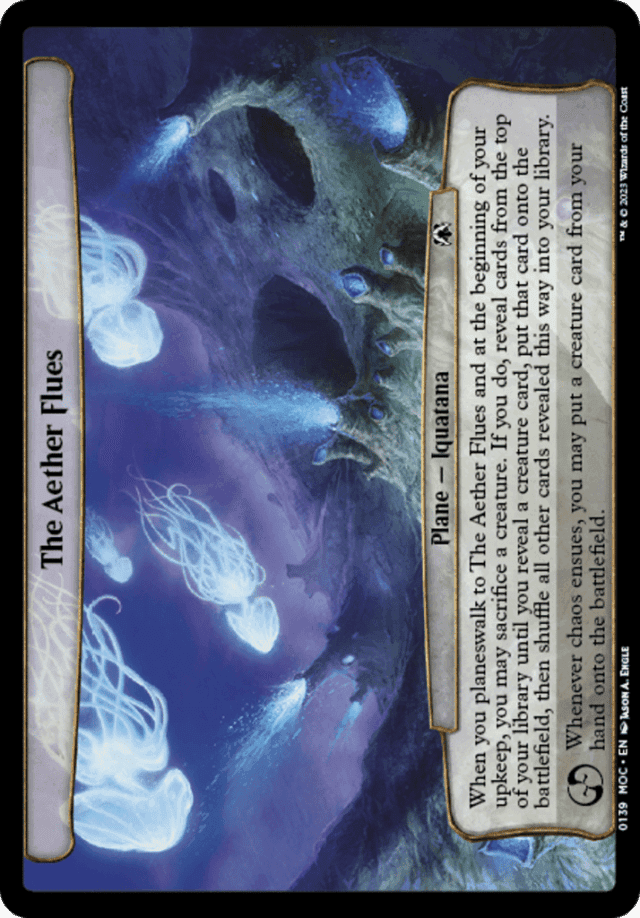 When you planeswalk to The Aether Flues and at the beginning of your upkeep, you may sacrifice a creature. If you do, reveal cards from the top of your library until you reveal a creature card, put that card onto the battlefield, then shuffle all other cards revealed this way into your library. Whenever chaos ensues, you may put a creature card from your hand onto the battlefield.