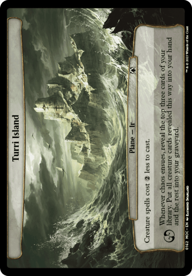 A face-up plane card that's turned face down becomes a new object with no relation to its previous existence. In particular, it loses all counters it may have had. — A plane card is treated as if its text box included "When you roll {PW}, put this card on the bottom of its owner's planar deck face down, then move the top card of your planar deck off that planar deck and turn it face up." This is called the "planeswalking ability." — If an ability of a plane refers to "you," it's referring to whoever the plane's controller is at the time, not to the player that started the game with that plane card in their deck. Many abilities of plane cards affect all players, while many others affect only the planar controller, so read each ability carefully. — If there are fewer than three cards in your library as the chaos ability resolves, you'll reveal all the cards in your library. — The controller of a face-up plane card is the player designated as the "planar controller." Normally, the planar controller is whoever the active player is. However, if the current planar controller would leave the game, instead the next player in turn order that wouldn't leave the game becomes the planar controller, then the old planar controller leaves the game. The new planar controller retains that designation until they leave the game or a different player becomes the active player, whichever comes first. — Turri Island's first ability can't reduce the cost to cast a creature spell to less than {0}.