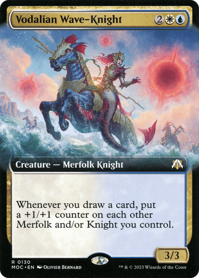 Whenever you draw a card, put a +1/+1 counter on each other Merfolk and/or Knight you control.