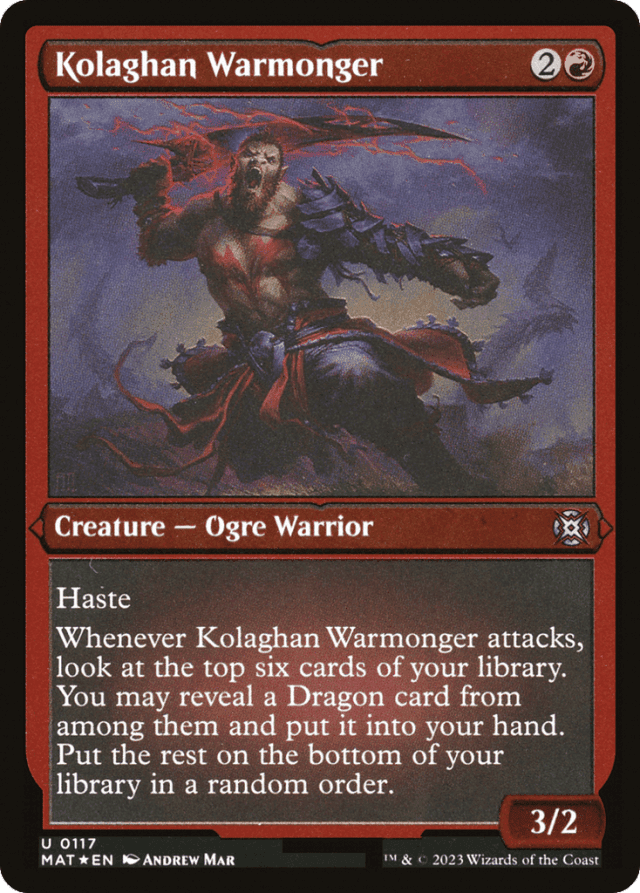Haste Whenever this creature attacks, look at the top six cards of your library. You may reveal a Dragon card from among them and put it into your hand. Put the rest on the bottom of your library in a random order.