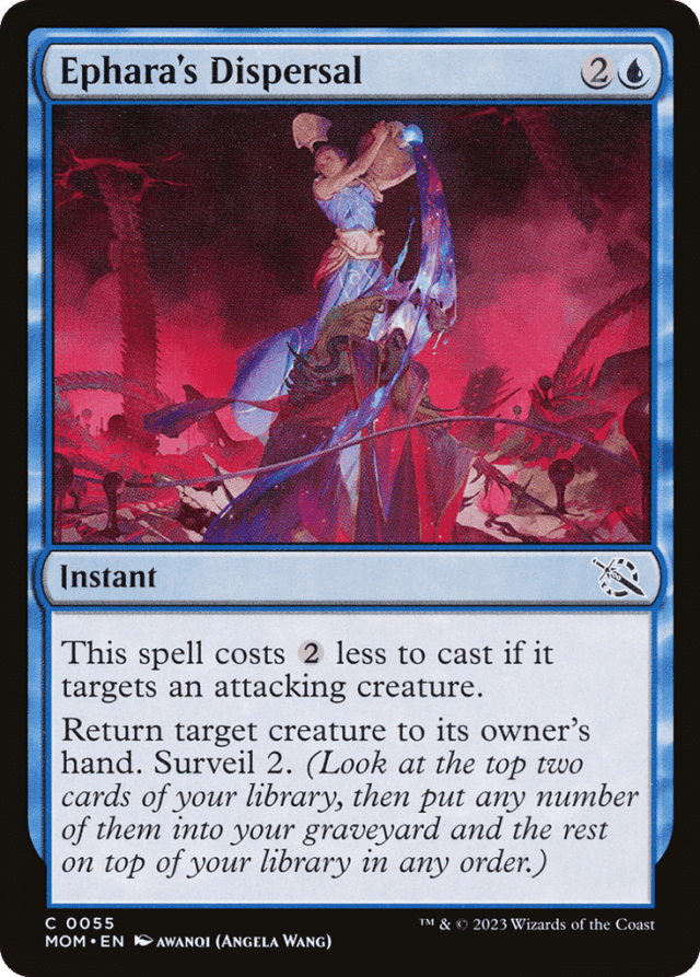 The cost reduction ability of Ephara's Dispersal doesn't affect its mana cost or mana value. It affects only the total cost you pay. Specifically, its mana value is always 3. — When you surveil, you may put all the cards you look at back on top of your library, you may put all of those cards into your graveyard, or you may put some of those cards on top and the rest of them into your graveyard. — You perform the actions stated on a card in sequence. For some spells and abilities, you'll surveil last. For others, you'll surveil and then perform other actions.