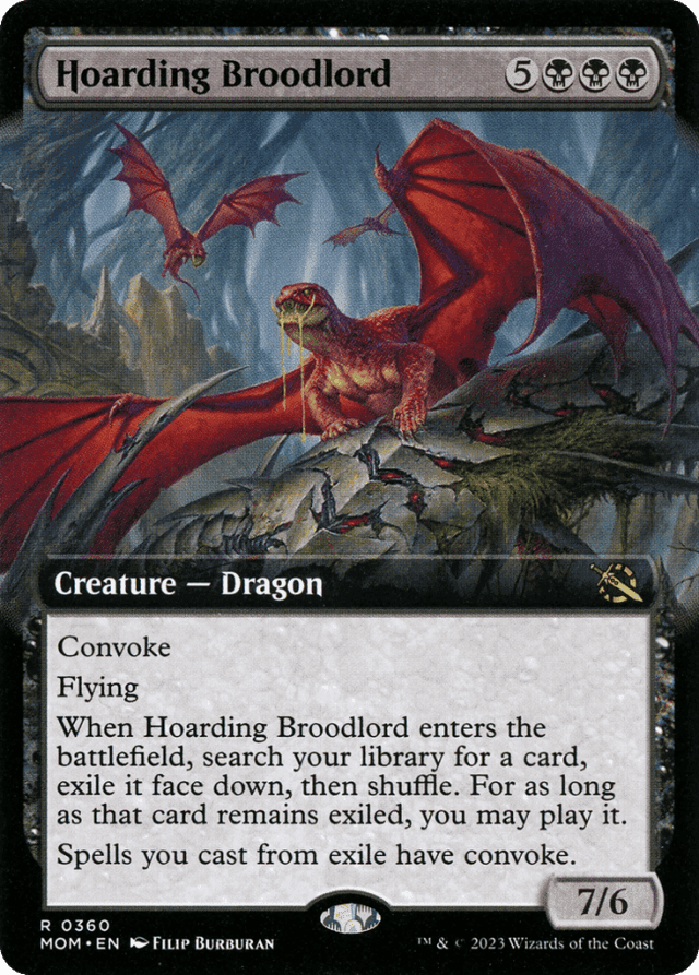 As long as that card remains exiled, you may look at it. This remains true after Hoarding Broodlord leaves the battlefield. — If another player gains control of Hoarding Broodlord, it's still you who can look at and play the exiled card. That player won't be able to look at or play the exiled card. — Because convoke isn't an alternative cost, it can be used in conjunction with alternative costs. — If a creature you control has a mana ability with {T} in the cost, activating that ability while casting a spell with convoke will result in the creature being tapped before you pay the spell's costs. You won't be able to tap it again for convoke. Similarly, if you sacrifice a creature to activate a mana ability while casting a spell with convoke, that creature won't be on the battlefield when you pay the spell's costs, so you won't be able to tap it for convoke. — Tapping a multicolored creature using convoke will pay for {1} or one mana of your choice of any of that creature's colors. — Tapping an untapped creature that's attacking or blocking to convoke a spell won't cause that creature to stop attacking or blocking. — When calculating a spell's total cost, include any alternative costs, additional costs, or anything else that increases or reduces the cost to cast the spell. Convoke applies after the total cost is calculated. Convoke doesn't change a spell's mana cost or mana value. — You can tap any untapped creature you control to convoke a spell, even one you haven't controlled continuously since the beginning of your most recent turn.
