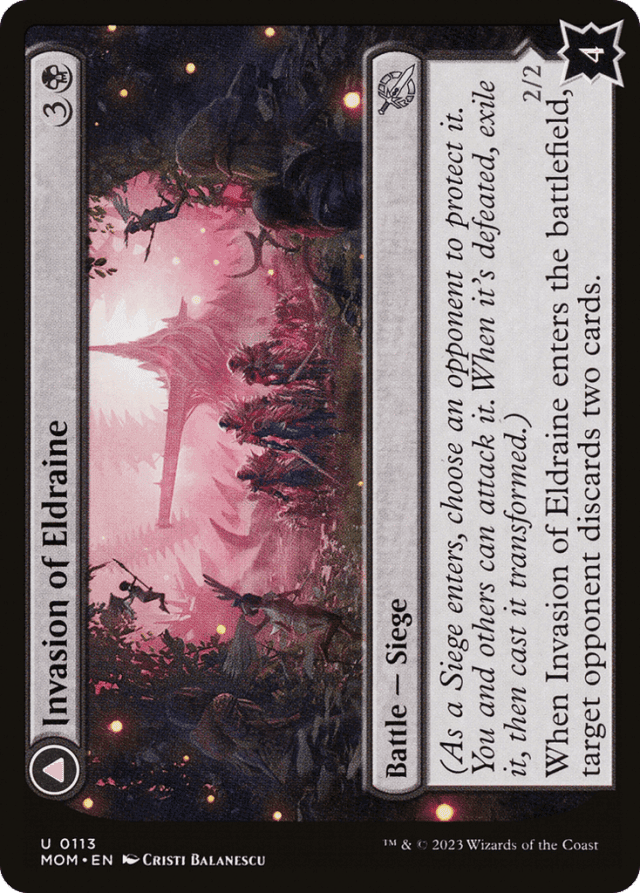 A Siege’s controller can’t be its protector. If a Siege’s protector ever gains control of it, they choose a new player to be its protector. This is a state-based action. — A battle can be attacked by all players other than its protector. Notably, this means a Siege’s controller can attack it. — A battle can be dealt damage and be target of spells and/or abilities that target “any target.” — A battle’s “defense” is displayed in the bottom right corner of the card. A battle enters the battlefield with that number of defense counters. If another permanent enters the battlefield as a copy of a battle, it also enters with that number of defense counters. — As a Siege enters the battlefield, its controller chooses an opponent to be its protector. — Battles can’t attack or block, even if one also becomes a creature. If an attacking or blocking creature somehow becomes a battle in addition to being a creature, it is removed from combat. — Damage dealt to a battle causes that many defense counters to be removed from it. — If a Siege never had defense counters on it (perhaps because a permanent became a copy of one), it can’t have its last defense counter removed. It will be put into its owner’s graveyard. You won’t exile it or cast the other face. — If a battle has no defense counters, and it isn’t the source of a triggered ability that has triggered but not yet left the stack, that battle is put into its owner’s graveyard. This is a state-based action. This doesn’t cause a Siege’s intrinsic triggered ability to trigger. — If a battle that’s being attacked somehow stops being a battle, it is removed from combat. Similarly, if its controller changes in the middle of combat, it is removed from combat. — If a non-battle permanent that is already on the battlefield become a copy of a Siege, its controller chooses one of their opponents to be that battle’s protector. However, it will most likely be put into its owner’s graveyard because it has no defense counters (see below). — If a permanent that is represented by a transforming double-faced card becomes a copy of a Siege, it will be exiled as that Siege’s triggered ability resolves, then it will be cast transformed. Note that this applies only to transforming double-faced cards, not to modal double-faced cards that can normally be played using either face. — If a token or a card that isn’t represented by a transforming double-faced card becomes a copy of a Siege, it can’t be cast as its triggered ability resolves. It will remain in exile. If it’s a token, it will cease to exist the next time state-based actions are performed. — In a multiplayer game, if the protector of a battle leaves the game and that battle is not currently being attacked, its controller chooses a new protector for it as a state-based action. If it is being attacked, its controller chooses a new protector for it once no creatures are attacking it. This means that it continues to be attacked and can be dealt combat damage as normal. — Only creatures controlled by a battle’s protector can block creatures that are attacking that battle. This means a Siege’s controller can never assign creatures to block for it. — Prickle Faeries’s ability will check as each opponent’s upkeep begins whether that player has two or fewer cards in hand. If they have three or more, the ability won’t trigger at all. If the ability does trigger, it will check the opponent’s hand again as it tries to resolve. If the opponent has three or more cards in hand at that time, the ability won’t resolve, and Prickle Faeries won’t deal damage to them. — Sieges each have an intrinsic triggered ability. That ability is “When the last defense counter is removed from this permanent, exile it, then you may cast it transformed without paying its mana cost.”