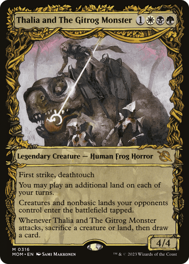 First strike, deathtouch You may play an additional land on each of your turns. Creatures and nonbasic lands your opponents control enter tapped. Whenever Thalia and The Gitrog Monster attacks, sacrifice a creature or land, then draw a card.