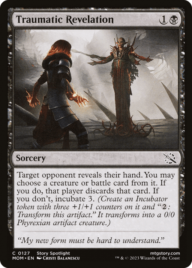 Target opponent reveals their hand. You may choose a creature or battle card from it. If you do, that player discards that card. If you don't, incubate 3. (Create an Incubator token with three +1/+1 counters on it and "{2}: Transform this token." It transforms into a 0/0 Phyrexian artifact creature.)