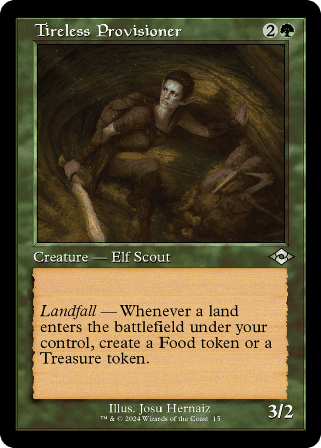 Landfall — Whenever a land you control enters, create a Food token or a Treasure token. (Food is an artifact with "{2}, {T}, Sacrifice this token: You gain 3 life." Treasure is an artifact with "{T}, Sacrifice this token: Add one mana of any color.")