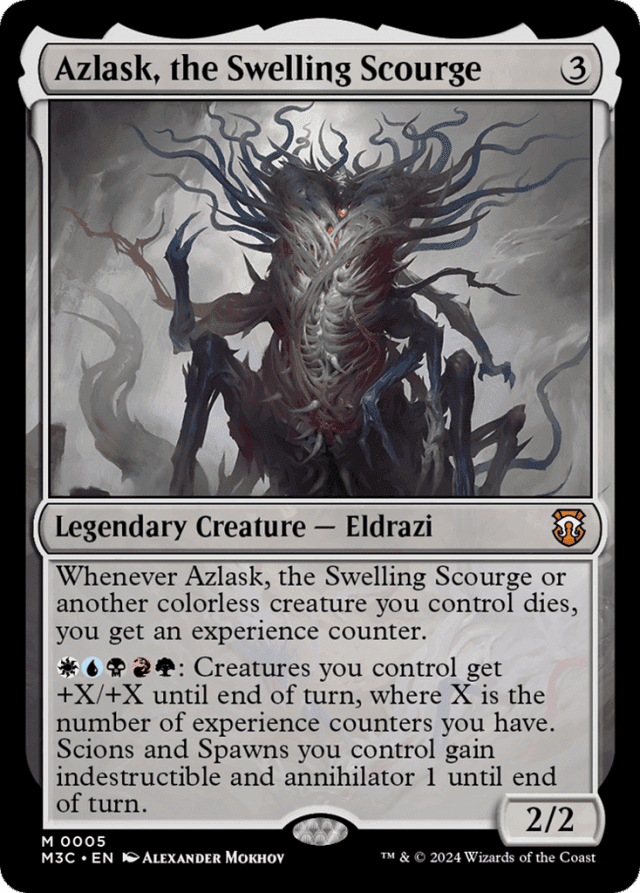Whenever Azlask or another colorless creature you control dies, you get an experience counter. {W}{U}{B}{R}{G}: Creatures you control get +X/+X until end of turn, where X is the number of experience counters you have. Scions and Spawns you control gain indestructible and annihilator 1 until end of turn.